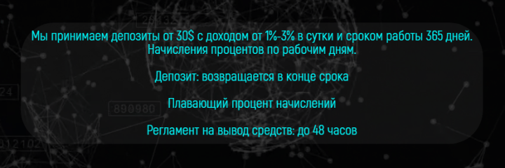 Инвестиционный план разработан с единственным предложением для приёма депозитов на длительный период сроком в 365 дней. Начисления на баланс производятся 5 дней в неделю, с понедельника по пятницу, по гибкой тарифной ставке от 1% до 3% в сутки. Минимальная сумма вкладов доступна от 30$, в конце срока вложенные средства возвращаются.