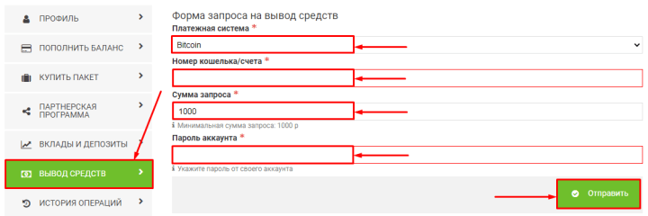 4. Для заказа выплаты зайдите в кабинете в раздел «Вывод средств«. Выберите платёжную систему, укажите адрес кошелька, введите сумму вывода и пароль, после чего нажмите кнопку «Отправить».