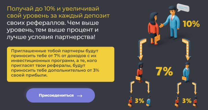 Партнерская программа: 4%-10% от вкладов и 7% от прибыли ваших рефералов + 3% от прибыли рефералов 2-го уровня.