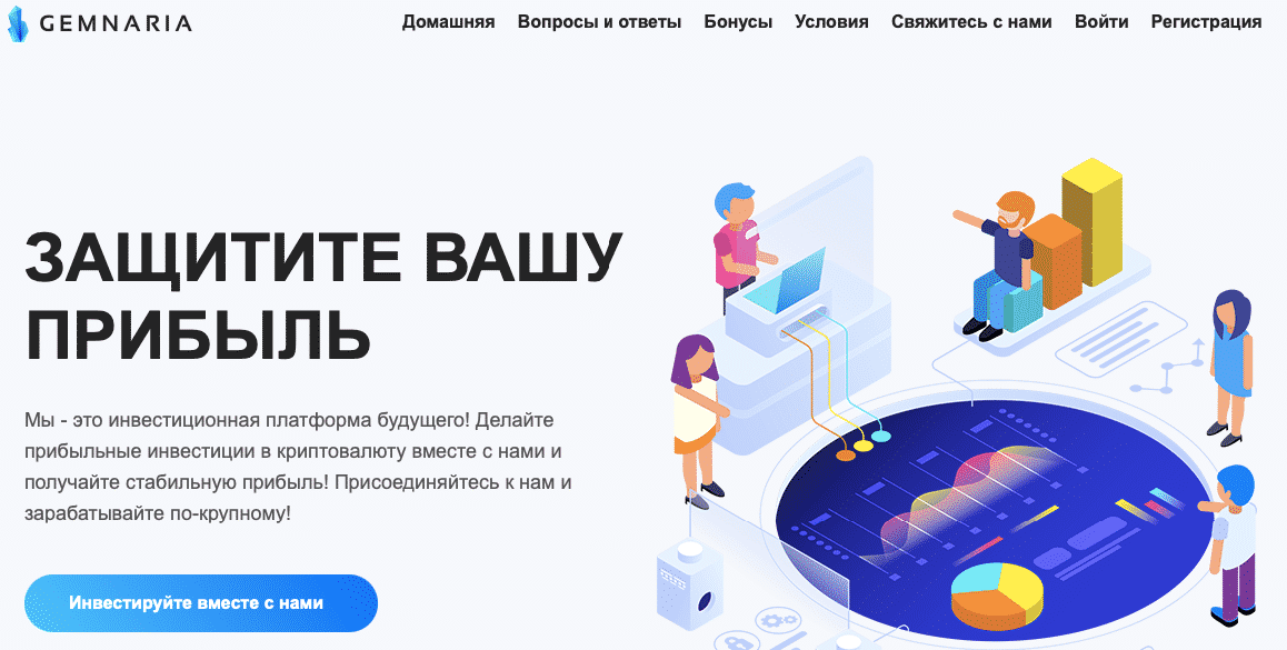 По легенде, Gemnaria представляет собой инвестиционную платформу, которая предоставляет возможность заработка на криптовалюте. Эксперты и аналитики проекта тщательно распределяют финансы между различными инвестиционными инструментами и используют уникальные алгоритмы оптимизации портфеля. На сайте не предоставляется каких-либо подробностей о такой деятельности, пользователям лишь в общих чертах описывают направление работы площадки. Что касается официальной регистрации, то документы на страницах ресурса не представлены, но указано, что компания легализирована в Великобритании и имеет сертификат №13142785.