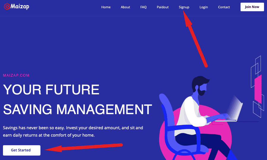 1. Начать работу с Maizap можно с главной страницы фонда, перейти на которую вы можете по партнерской ссылке блога. Далее воспользуйтесь кнопкой «Signup» в шапке сайта или «Get started» по центру страницы.