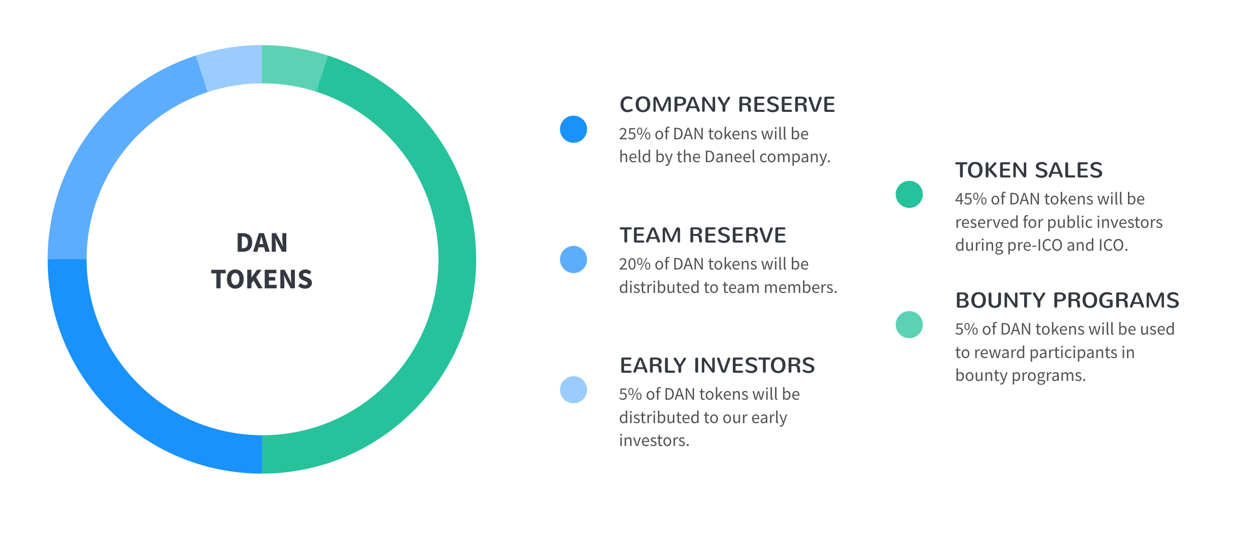 Тонеры Daneel (DAN) будут использоваться только для подписки на интеллектуального помощника услуг, предлагаемых «Помощницей компании Daneel». Общий запас токенов DANEEL ограничен 100 000 000 токенов. Процесс продажи токенов DAN будет выполнен в два этапа. В течение декабря 2017 и январе 2018 года.