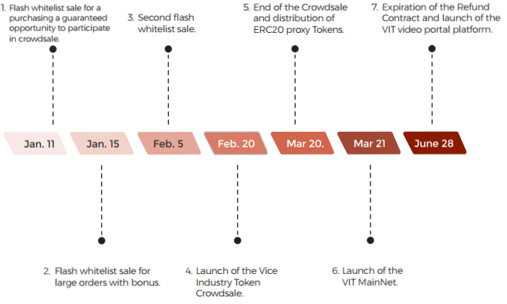 В январе 2018 года проведен набор участников для осуществления продажи токенов. В феврале 2018 года была осуществлена вторая часть продажи. В марте 2018 года будет завершен Crowdsale, также окончится распределение токенов прокси-сервера ERC20. В этом же месяце будет осуществлен запуск VIT MainNet. В июне 2018 года завершится срок действия договора возврата, запуск видео VIT.